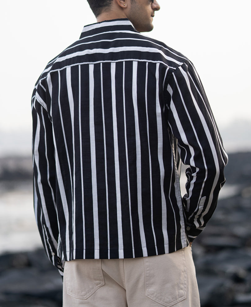Make a bold yet effortless statement with this black lightweight striped shirt. Designed with crisp vertical white stripes, it offers a flattering, elongated silhouette that suits any occasion. Crafted from breathable fabric, this shirt ensures all-day comfort while keeping your style sharp. The button-down front and classic collar give it a timeless appeal — perfect for both casual outings and smart-casual events.
