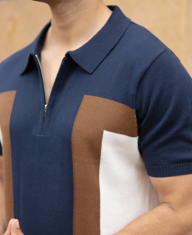 A nod to retro sophistication, this polo t-shirt features a sun-washed stripe pattern that merges earthy ochres and cream tones. Ideal for sunny brunches or gallery visits, its zipper placket adds a casual edge