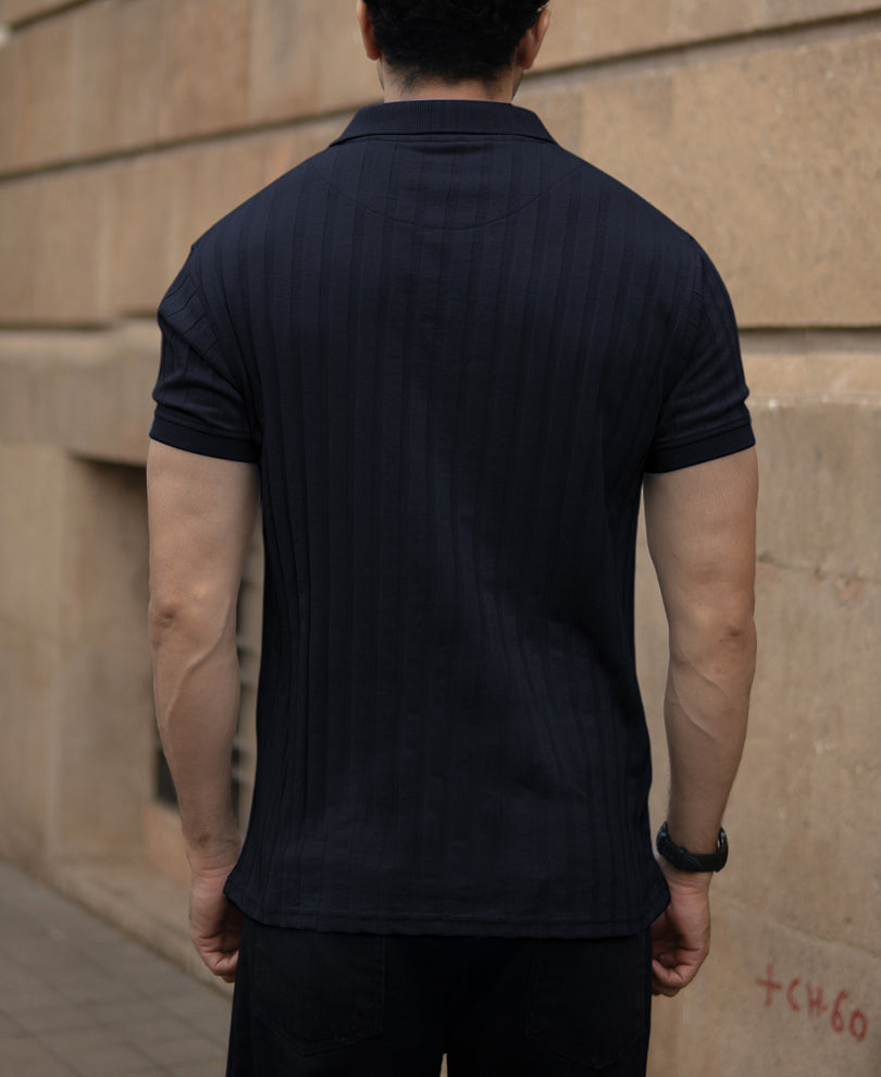 Think dark, deep, and undeniably smooth. This Navy Self Stripe T-Shirt channels rich hues and textured tactility, giving you that well-dressed look without any extra effort. Ribbed to perfection and tailored for a comfortable fit, it’s your quiet flex for everything from date nights to downtime.